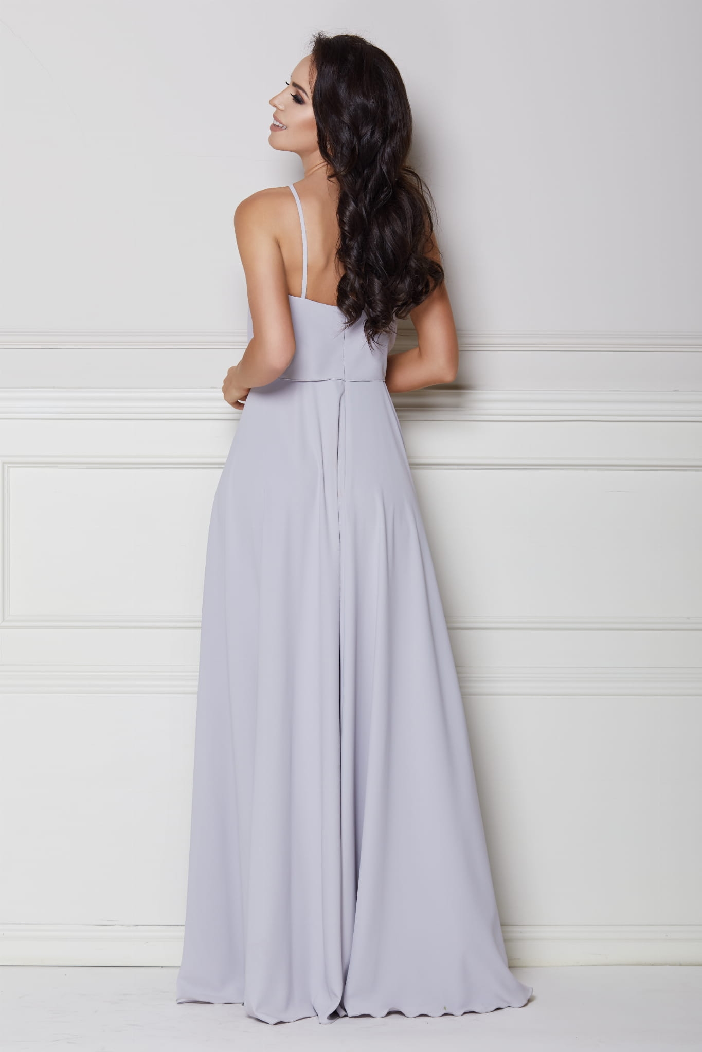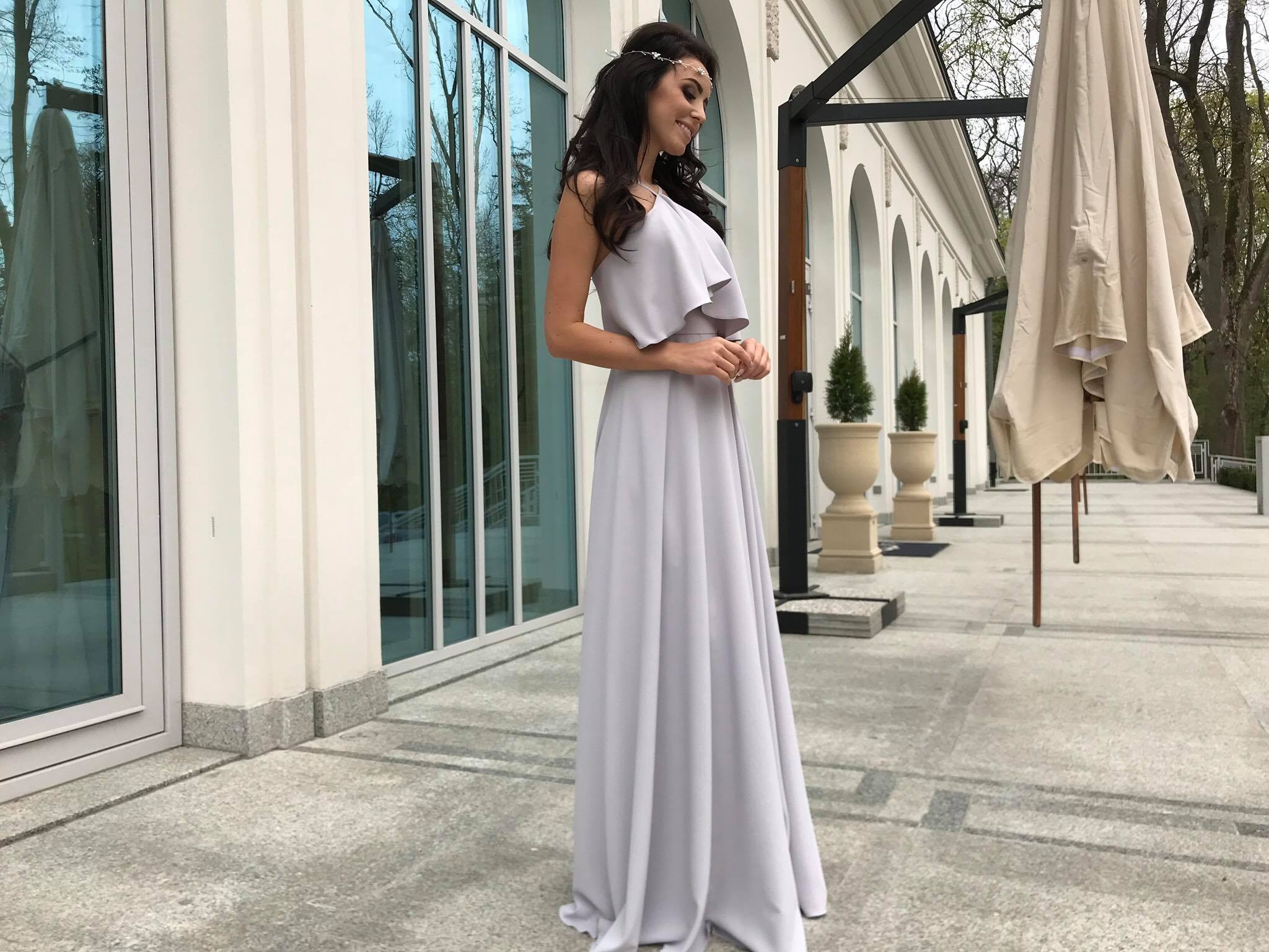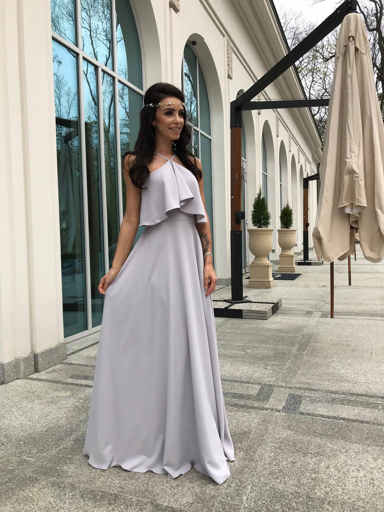 LIVIA - Długa szara suknia z falbaną